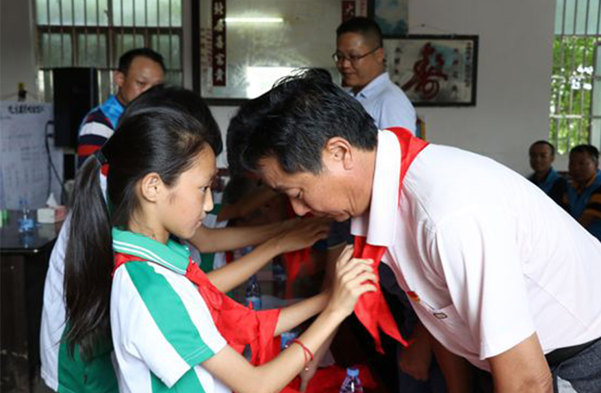 困難學(xué)生為出席捐贈(zèng)儀式的領(lǐng)導(dǎo)與愛(ài)心企業(yè)獻(xiàn)上紅領(lǐng)巾